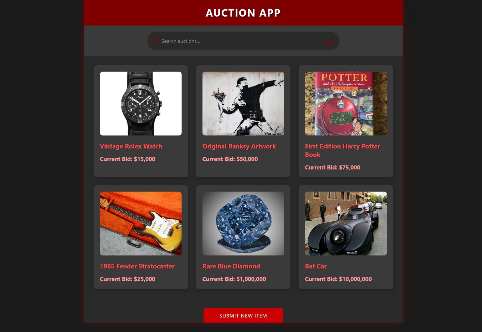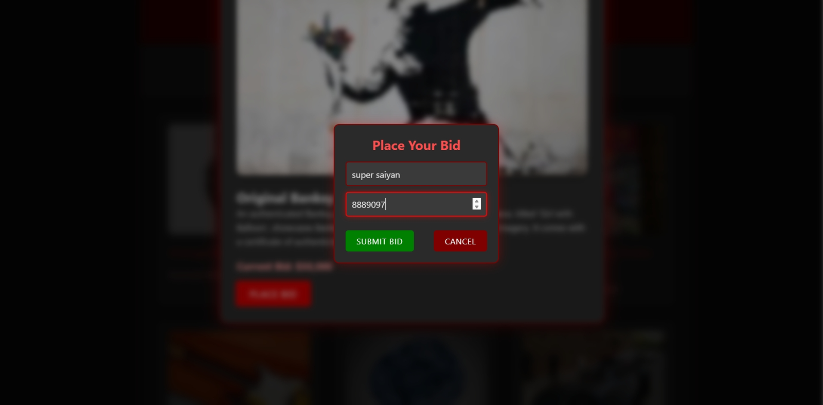The heart of the app, JavaScript, orchestrates the functionality like a conductor leading a symphony. It dynamically builds auction items, from a vintage Rolex to an original Banksy artwork, populating the auction list in real-time with every item displayed in full glory. Each click triggers a detailed modal that opens up with product images and descriptions, offering a compelling experience to the bidders.