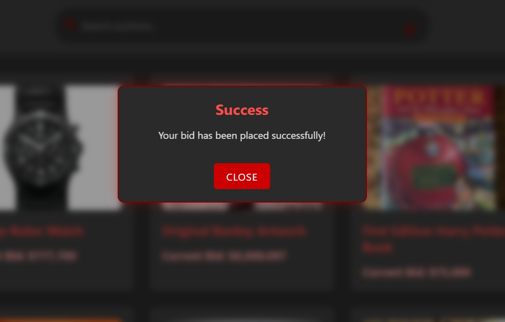 Bidding becomes an exhilarating process as JavaScript synchronizes with the backend, allowing users to place bids effortlessly, with pop-up prompts ensuring the user journey remains fluid and intuitive. Real-time auction updates, filter capabilities, and pop-up alerts make sure the users are always in the loop of action.