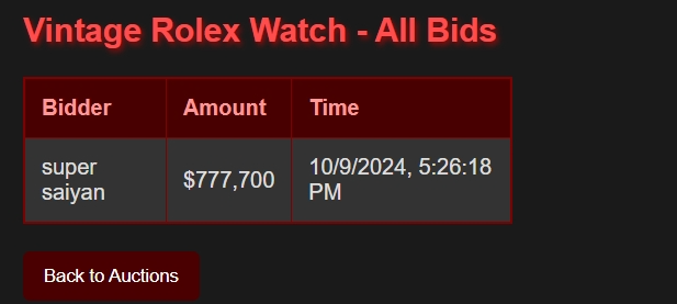 Authentication is enforced through secure session handling, making sure only authorized users can access and control the panel. With the admin panel's real-time functionality, detailed bid tracking, and easy navigation, administrators can efficiently oversee all auction activities and ensure that each auction runs smoothly and securely.